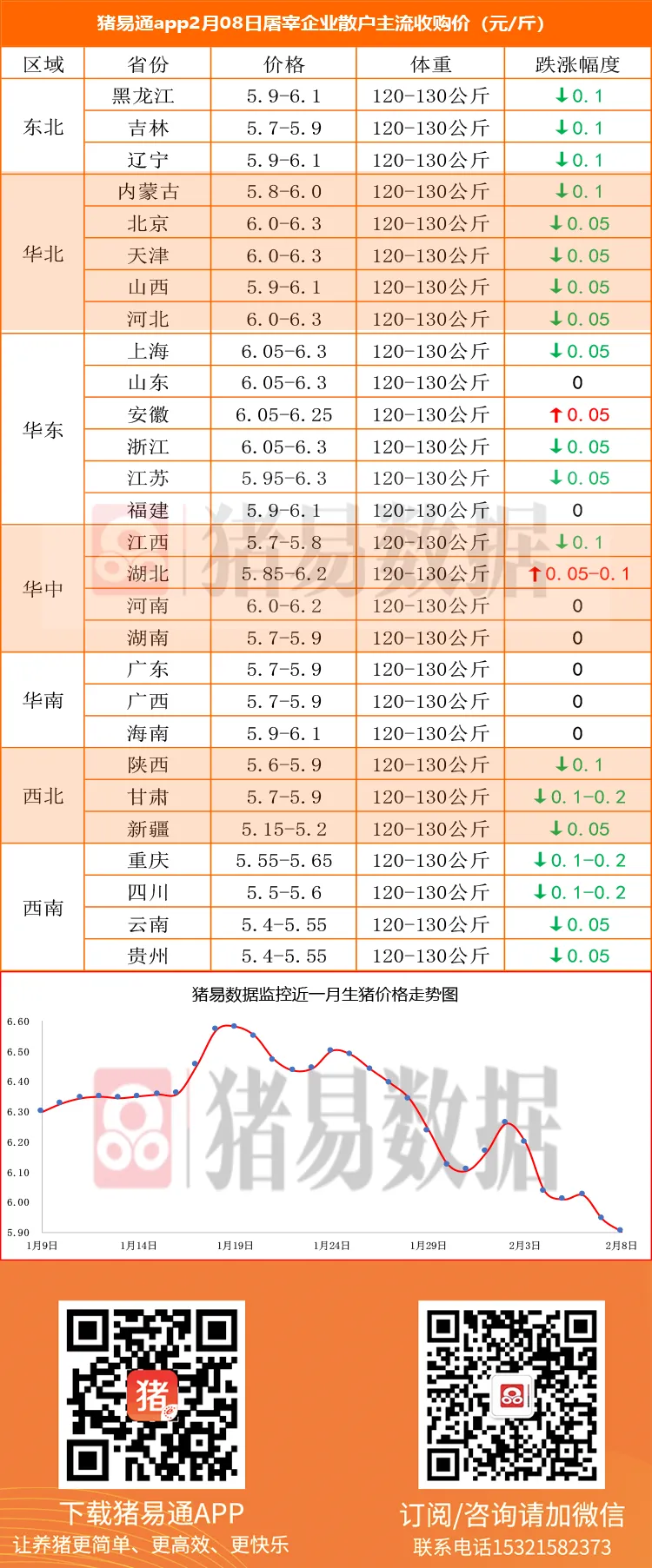 据猪易数据监测数据显示,2026年2月08日标准体重生猪平均价格为11.81元/公斤,较昨日猪价下跌0.08元/公斤,跌幅为0.67%,同比25年同期14.56元/公斤下跌2.75元/公斤,跌幅为18.89%。