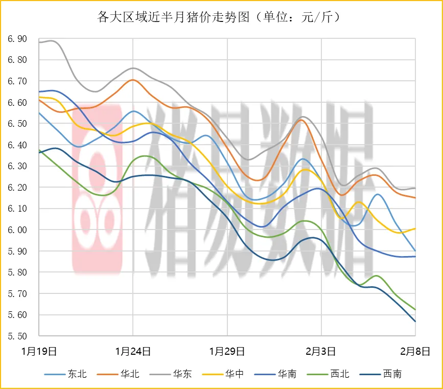 东北、华北、西北、西南地区猪价呈现下跌,华东、华南地区猪价呈现稳定,华中地区猪价呈现微涨,生猪平均价格呈现微跌。