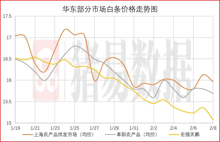 从今日北京、上海消费城市批发市场白条价格走势来看,北京、上海批发市场白条成交价格呈现稳中伴跌,北京市场开磅价稳定为主,市场成交均价表现一般,市场走货速度表现一般;上海市场价格呈现下跌,部分市场成交价参考15.5-15.97元/公斤,到货量增加,市场交易情绪表现差,市场成交均价表现较差。