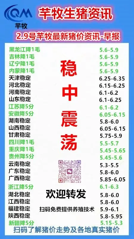 2026年2月9号芊牧最新猪价资讯-早报(稳中震荡) 养羊网 2026-02-08 2026年2月9号芊牧最新猪价资讯-早报(稳中震荡) 养羊网 2026-02-08 上一篇:明日猪价 | 2026.2.9日~全国各地最新猪价(猪价飘绿) 下一篇:2026.2.9 明日猪价! 您可能还会对下面的文章感兴趣111: 相关文章 今日猪价|【仔猪价格】2026.1.24 想闷声发大财,建议做这16件事 近期价格更新!!! 近期价格更新!!!
