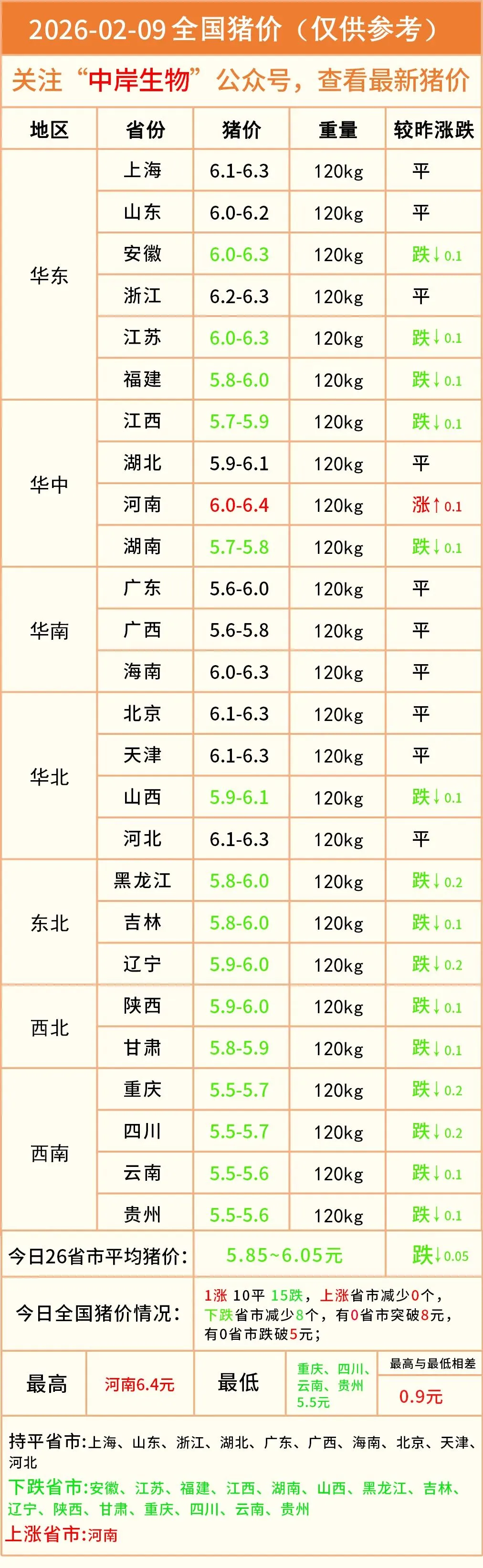 明日猪价|2026-02-09全国最新猪价(猪价已更新!) 养羊网 2026-02-08 明日猪价|2026-02-09全国最新猪价(猪价已更新!)营销中心丨0731-83806009技术服务丨0731-83806019 养羊网 2026-02-08 上一篇:2月8日全国猪价跌幅收窄【动力猪价】 下一篇:2月9日 全国猪价早知道! 您可能还会对下面的文章感兴趣111: 相关文章 ??养牛想让牛长得快?这些饲料别错过 每天记录一个食物|DAY⑧⑨肉松鸡蛋卷蛋糕 2025年4月13日全国各地生猪价格信息 一米八壮汉的下午茶