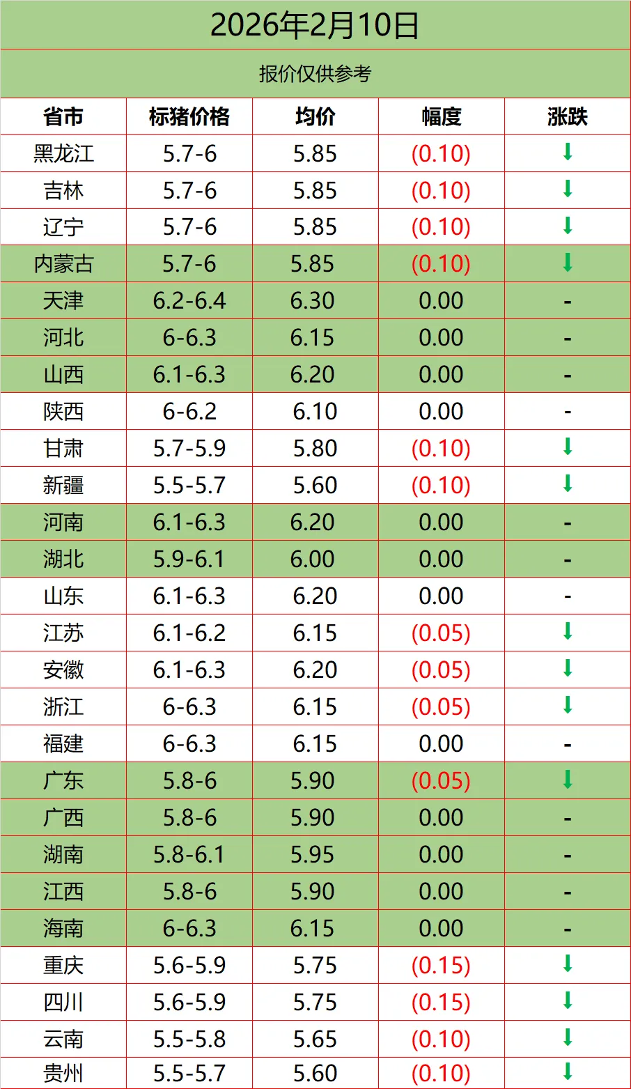 2月10日 猪价早知道 养羊网 2026-02-09 2月10日 猪价早知道?猪价早知道,关注? 养羊网 2026-02-09 上一篇:【悦丰饲料】2026年2月9日猪价播报 下一篇:2月国内猪价短暂冲高后回落,农历春节前市场供需关系总体偏宽松 您可能还会对下面的文章感兴趣111: 相关文章 2025年4月13日全国各地生猪价格信息 近期价格更新!!! 紧急提醒:猪价上涨面临压力,出栏窗口收紧! 鸡蛋2501