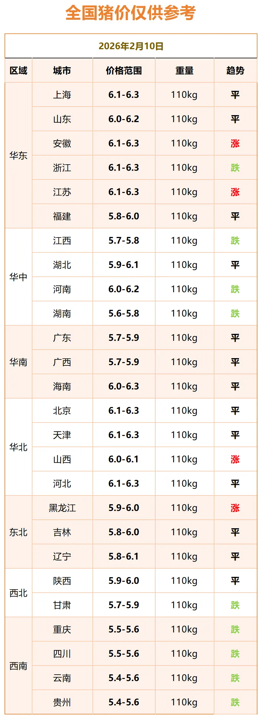 明日猪价早知道~全国部分地区猪价持平,小部分地区猪价下跌或上涨! 养羊网 2026-02-09 明日猪价早知道~全国部分地区猪价持平,小部分地区猪价下跌或上涨!猪价播报2026年2月10日全国猪价播报全国猪价播报~END~长按识别二维码关注我们 养羊网 2026-02-09 上一篇:猪价冰火两重天!北方抢猪大战每斤冲到6块5,南方养殖户含泪5块6甩卖! 下一篇:猪价三连跌!小年前夕生猪价格迎关键窗口!到底是涨还是跌? 您可能还会对下面的文章感兴趣111: 相关文章 原来甲鱼并不贵啊 遭遇猪蹄刺客,外面的世界怎么了? 这物价太吓人了 近期价格更新!!!