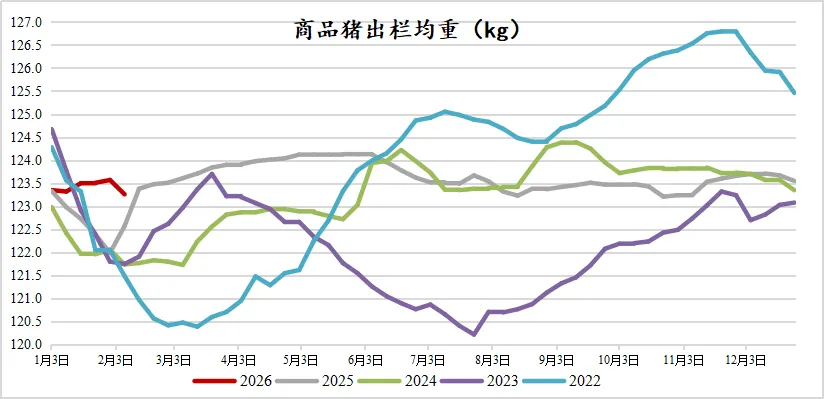 二、出栏均重开始下降,供应端节前加速出栏,2月的出栏压力仍偏大 本周出栏均重123.26kg,较上周下降0.31kg。但对比历史同期,今年的出栏均重依然偏高。一般春节前养殖端出栏积极,出栏体重会呈现环比持续下滑的趋势。但今年环比下降的拐点出现得较晚。随着春节降至,养殖端出栏速度加快,出栏的均重也随之下降。 据钢联数据,1月样本企业的实际出栏量为1424万头,高于2025年1月的1262万头。2月样本企业的计划出栏量为1206万头,较1月降低15.3%,但2月有效出栏天数下降更多,综合而言,2月的出栏压力依然偏大。尤其是当下市场对猪价的预期并不乐观,预计节前生猪市场仍面临较大的供应压力。