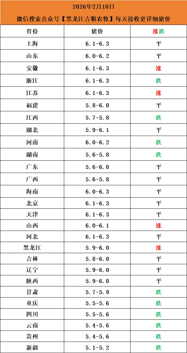 【黑龙江吉粮农牧】2026年2月10日猪价早知道点击上方"蓝字" 关注我们吧!
