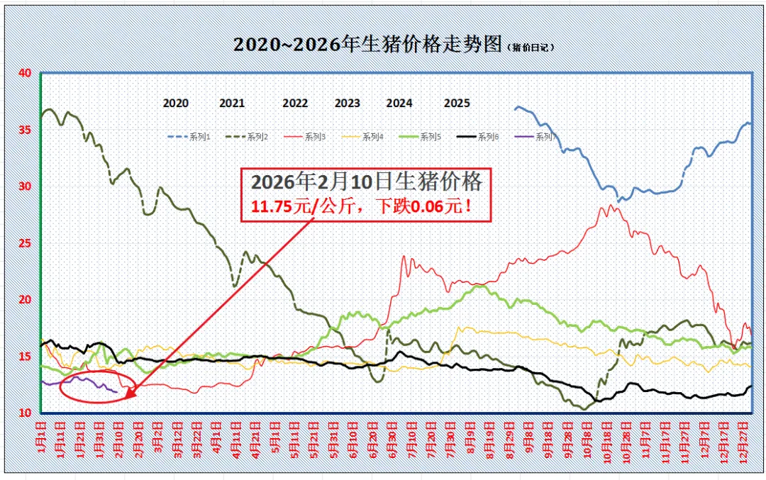 排队出栏,猪价下跌“跌不停”!附:2月10日猪价时光荏苒,小年在即,距离春节仅剩1周时间,近期,国内生猪市场,购销呈现双旺的局面,但是,基于供应压力集中兑现,猪价反弹不及预期,尤其是,春节前,需求跟进利好有限,市场基本面略显偏弱,春节前猪价能否短暂拉涨,关键在于阶段性供需格局的变化! 从基层反馈显示,目前,国内生猪供应方面,由于春节将至,年内出栏有效时间减少,虽然,本月头部猪企出栏计划减少,样本猪企出栏环比下降15.3%,可惜,由于月内出栏时间偏短,且,市场对于猪价前景有一致性看跌的操作,春节前,社会面以及规模以上猪企集中出栏,产能面临踩踏的压力,多元主体排队出栏,供应格局略显宽松! 在需求方面,目前,春节在即,由于今年春节偏晚,节前猪肉需求高峰被不断消化,虽然,临近春节,但是,消费跟进反馈不佳!毕竟,南方销区人员外流,且,腌腊完成,市场多以家庭购销为主,受饮食结构的变化以及替代品供应充足,猪肉消费跟进缺乏明显增加,下游白条购销表现一般!不过,由于小年到来,屠宰场节前仍有集中开工的操作,市场存在以支撑! 从基层数据了解,在国内主流集团方面,今天,河南地区,规模猪企标猪以及中猪报价下跌0.2~0.3元,广东地区大厂出栏报价偏稳,南北主流地区,散户猪场报价下调1~2毛,生猪市场呈现排队出栏现象,供应压力不减,市场有一定恐慌抛售的心态! 受供需调整,个人预估,2026年2月10日,外三元标猪报价下跌0.06元,生猪均价跌至11.75元/公斤,后市关注规模以上猪企出栏及屠宰场开工率变化!个人预估,由于年前备货高峰即将结束,虽然,市场仍有看涨心态,但是,理性来看,春节前猪价或难有实质性反弹的机会,提醒养殖户适时出栏,把握出栏时机,对此,大家是如何看待的呢?