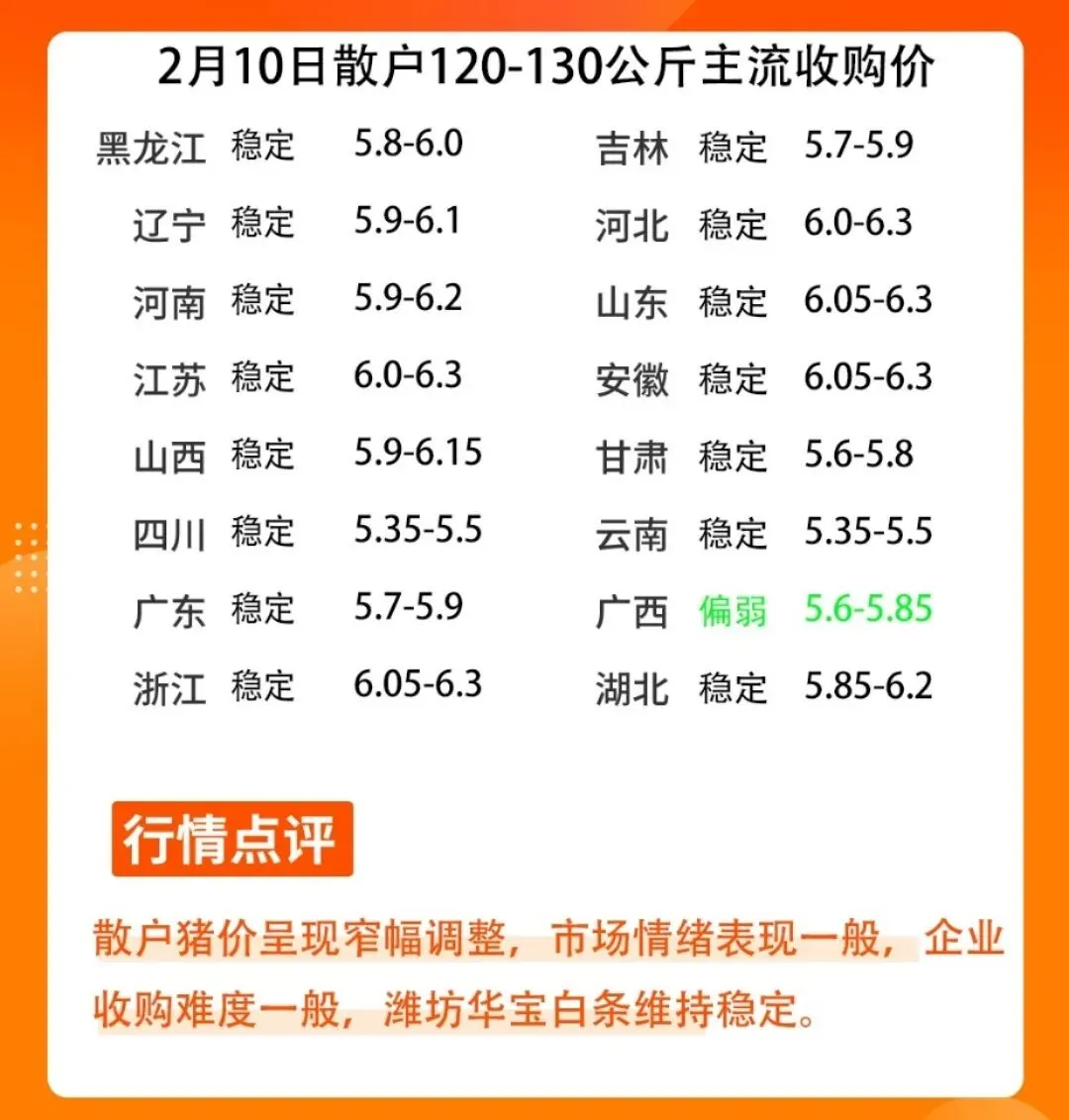 2月09日晚间猪价信息,今晚猪价情绪表现一般,屠宰企业采购难度一般,今晚白条猪价呈现跌涨调整,潍坊华宝白条出场价格维持稳定,安徽牧原、江苏牧原白条出场价格维持稳定,瘦白条下跌100元/吨,东北牧原白条出场价格维持稳定,肥白条上涨100元/吨,预计明日北方集团猪价呈现企稳,南方地区集团猪价呈现稳中有弱,重点关注集团生猪上市量。