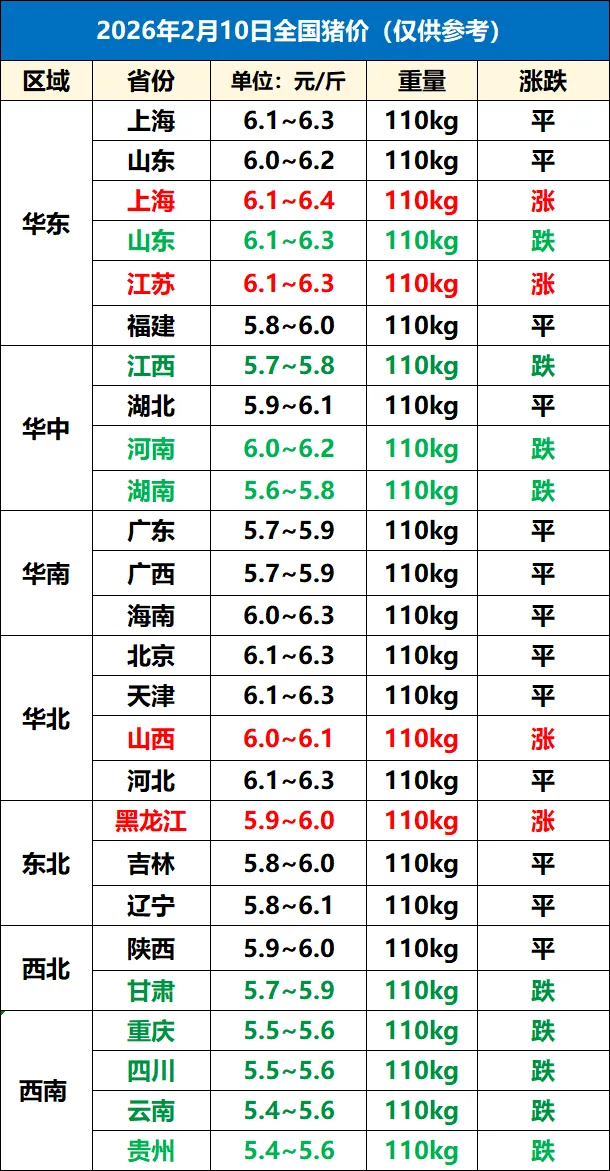 2月10日全国猪价一夜降温,下跌“坐滑梯”!小年纳福,祝您年年都如意!岁岁皆平安! 养羊网 2026-02-10 2月10日全国猪价一夜降温,下跌“坐滑梯”!小年纳福,祝您年年都如意!岁岁皆平安! 养羊网 2026-02-10 上一篇:2026年2月10日重庆鸡蛋收购参考价格 下一篇:春节前猪价还能涨多少?供应过剩或将导致“磨底期”延长 您可能还会对下面的文章感兴趣111: 相关文章 近期价格更新!!! 骆驼圈 重回鸡蛋2510 2025年4月13日全国各地生猪价格信息