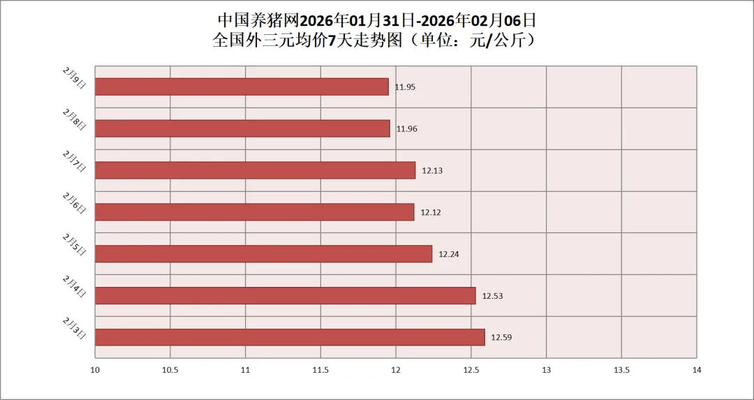 2026年02月09日(星期一),据中国养猪网猪价系统监测,全国外三元均价为11.95元/公斤,猪价较昨日(11.96元/公斤)下跌0.01元/公斤,较上月(12.61元/公斤)下跌了0.66元/公斤。