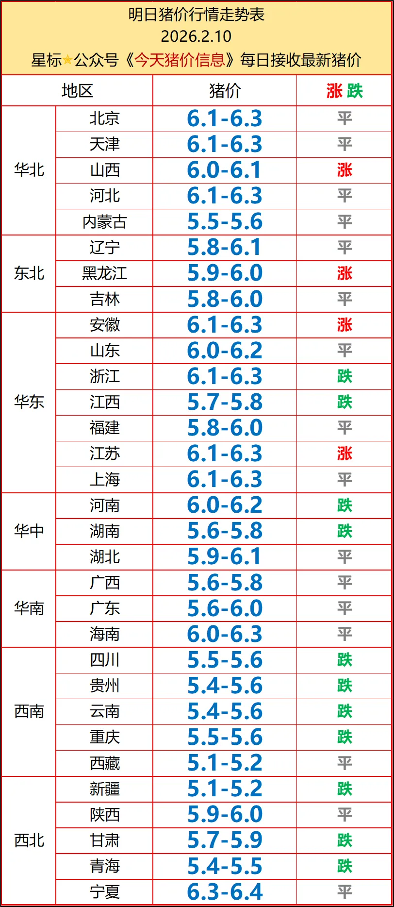 今日猪价 | 2026.2.11 明天猪价走势信息!2026年02月10日猪价行情:全国综合均价5.93元/斤 外三元:5.93元/斤,较昨日下跌0.05元 内三元:6.28元/斤,较昨日下跌0.03元 土杂猪:6.21元/斤,较昨日上涨0.01元