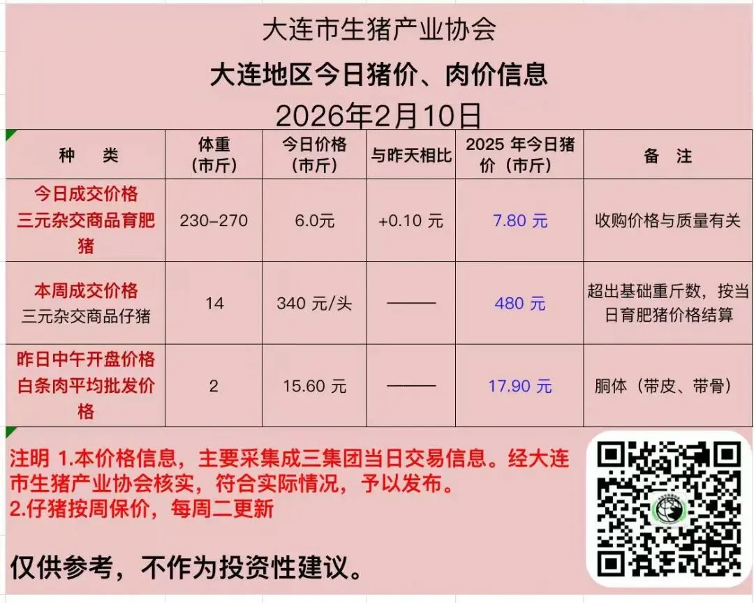 2026 年 2 月10日猪价、肉价信息 养羊网 2026-02-10 2026 年 2 月10日猪价、肉价信息天天报价大连市生猪产业协会 养羊网 2026-02-10 上一篇:【2月10日猪价】供应压力凸显,猪价区域分化窄幅震荡 下一篇:2026年2月10日东莞信立鸡蛋价格早报 您可能还会对下面的文章感兴趣111: 相关文章 这鸡蛋慢慢悠悠 赤峰游 DAY2 阿斯哈图石林?热阿线 吐鲁番必去!︳没有人能空手走出亚尔大巴扎 2025年4月13日全国各地生猪价格信息