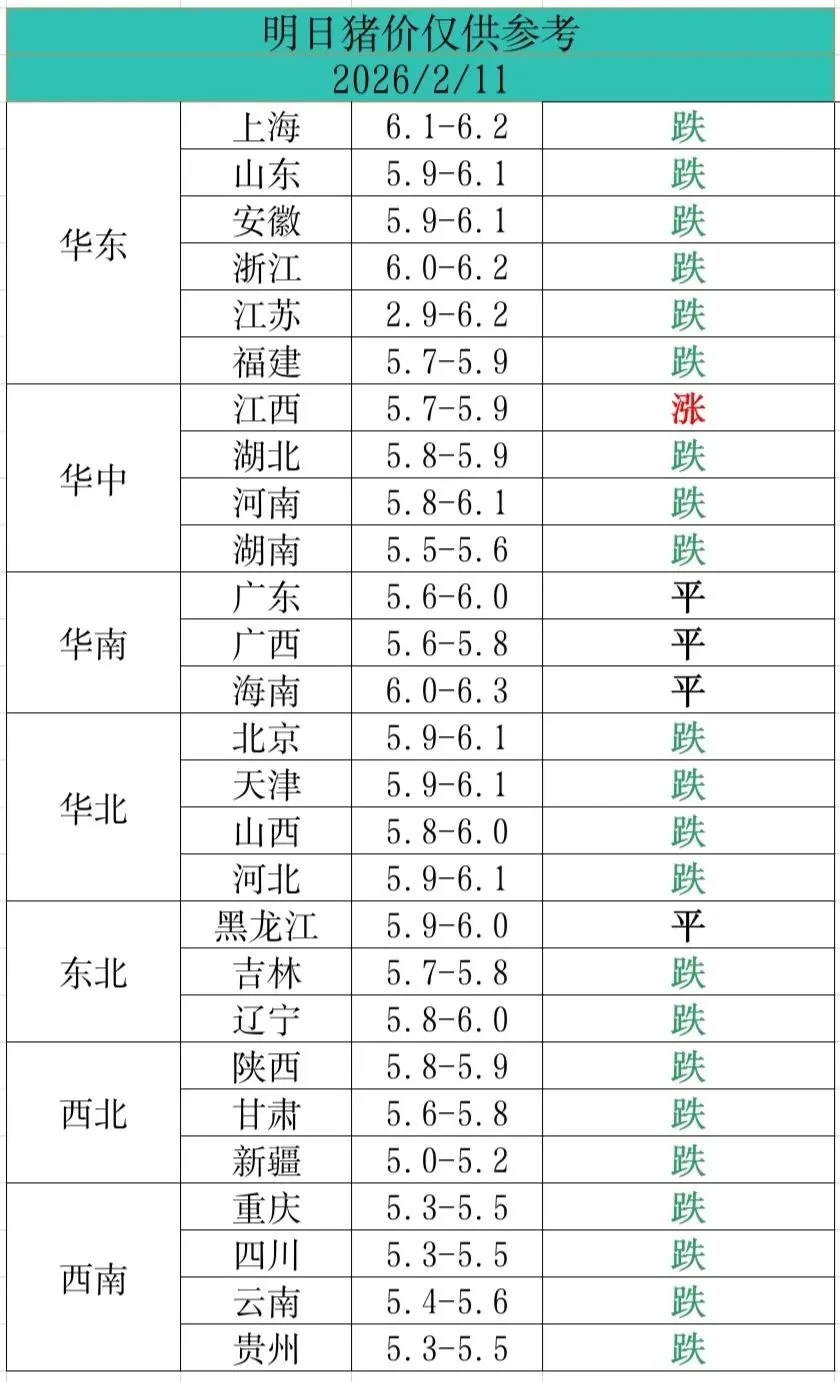 2026年2月11日全国猪价信息/供大家参考 养羊网 2026-02-10 2026年2月11日全国猪价信息/供大家参考 养羊网 2026-02-10 上一篇:江西独涨!2026.02.11-明日猪价 下一篇:2026-2- 11全国猪价预测 您可能还会对下面的文章感兴趣111: 相关文章 猪猪?的春天要来了 温氏股份 加班晚归多亏这锅!贵阳特色火锅推荐暖到胃 2025年4月13日全国各地生猪价格信息