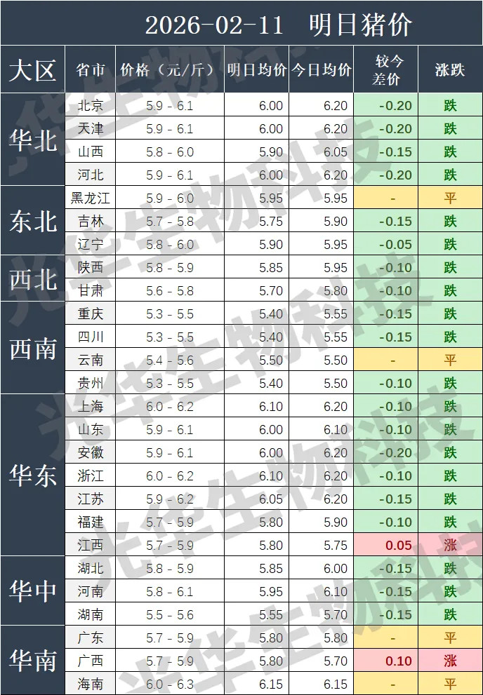2026-2- 11全国猪价预测 养羊网 2026-02-10 2026-2- 11全国猪价预测----- 养羊网 2026-02-10 上一篇:2026年2月11日全国猪价信息/供大家参考 下一篇:快乐养殖提醒您关注2026/2/11猪价 您可能还会对下面的文章感兴趣111: 相关文章 2025年4月13日全国各地生猪价格信息 2025年4月13日全国各地生猪价格信息 2025年4月13日全国各地生猪价格信息 近期价格更新!!!