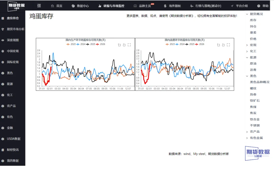 库存分析:环节库存双增,压力逐步显现库存是反映市场供需松紧的直接指标。当前,无论是生产环节还是流通环节,库存均呈现累积态势。数据显示,国内生产环节鸡蛋库存可用天数约为1.47天,处在历史同期中位,最近一个月生产库存+0.63天;流通环节库存可用天数约为1.77天,处在历史同期中位偏低位,最近一个月流通库存+0.74天。虽然绝对水平未至历史高位,但持续一个月的累库趋势表明,下游消化速度不及上游供应节奏,库存压力正在从养殖端向贸易环节传导,令现货价格承压。