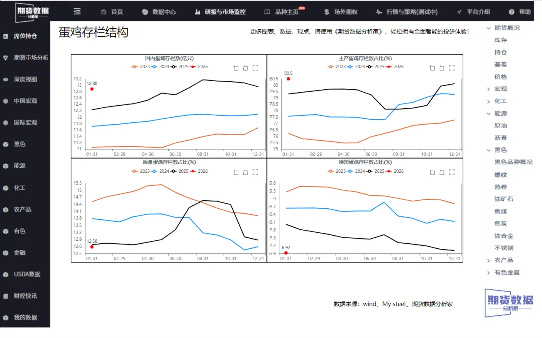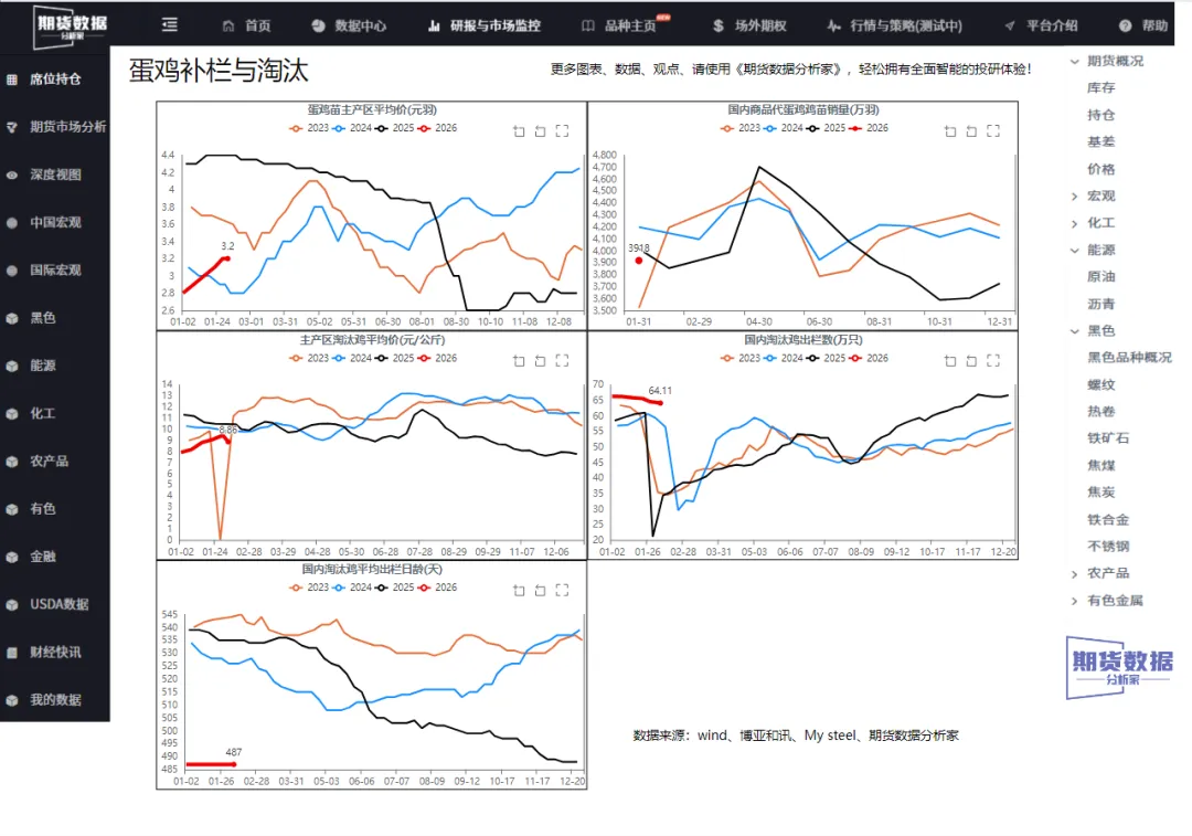 目前国内淘汰鸡出栏数约为64.11万只,处在历史同期高位,较去年同比+86.69%;同时,淘汰鸡平均出栏日龄约为487.0天,处在历史同期中位偏低位,较去年同比-8.97%。这表明养殖户在蛋价低迷的挤压下,正加速淘汰高龄低效蛋鸡。然而,从鸡苗价格看,目前蛋鸡苗主产区平均价参考价格为3.2元/羽,最近一个月+0.3元/羽,补栏积极性虽受抑制但并未完全消退,意味着中长期供应基础仍在。综合来看,尽管淘汰加速,但巨大的在产存栏基数使得短期供应宽松格局难以迅速扭转。