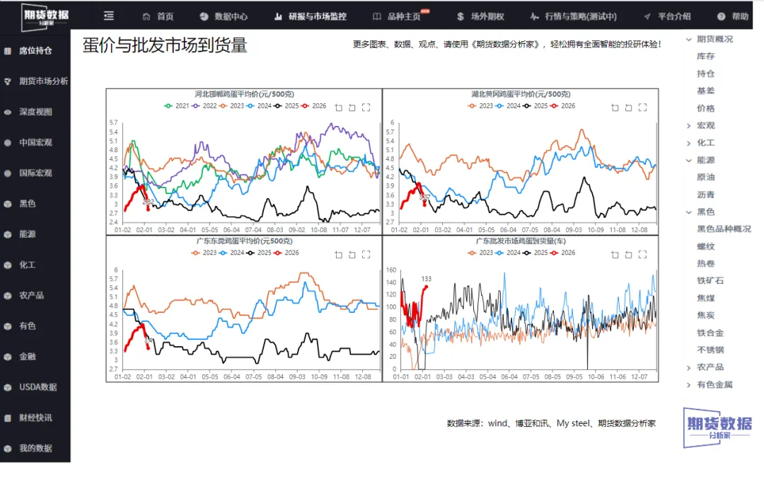 需求分析:备货结束,现货价格持续阴跌需求端是当前市场的核心拖累因素。春节备货旺季结束后,家庭库存有待消化,学校、工厂等团体消费尚未完全恢复,终端市场走货普遍偏慢。这一点在现货价格上得到充分体现。现货方面,河北邯郸鸡蛋平均价为2820.0元/500千克,最近一个月-50.0元/500千克。