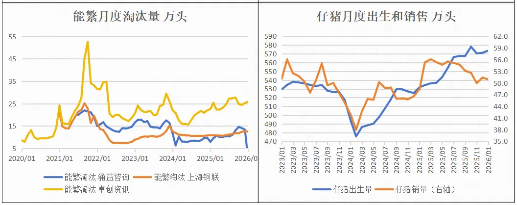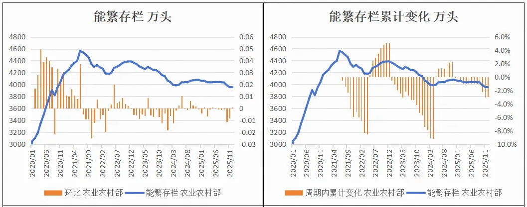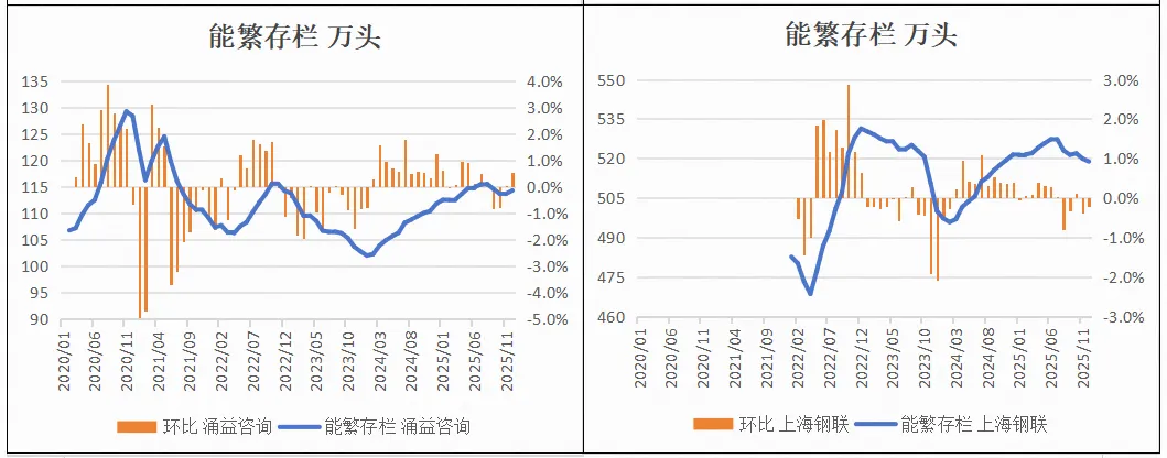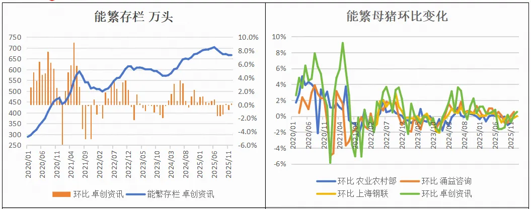 2025年12月,涌益咨询/上海钢联/卓创资讯能繁存栏环比+0.5%、-0.2%、+0.2%。