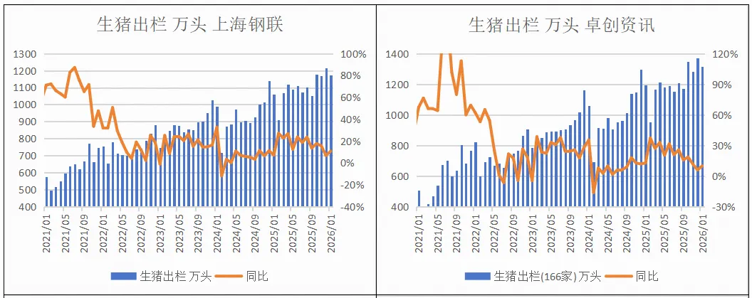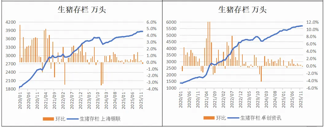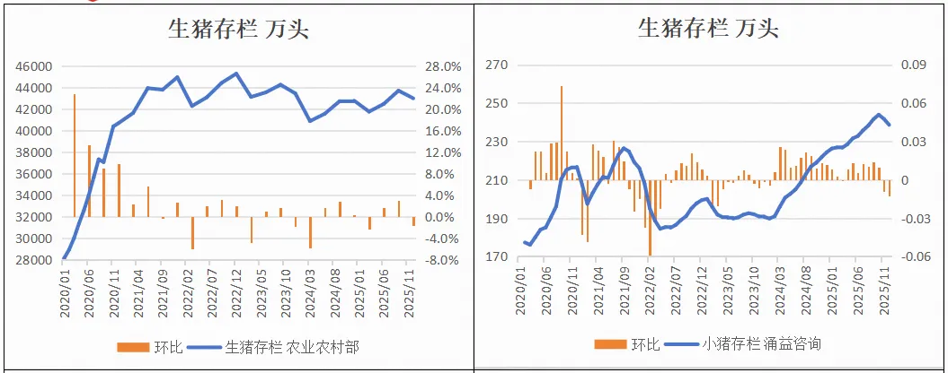2025年12月,涌益咨询/上海钢联/卓创资讯生猪存栏环比-1.3%、-3.9%、-0.2%。