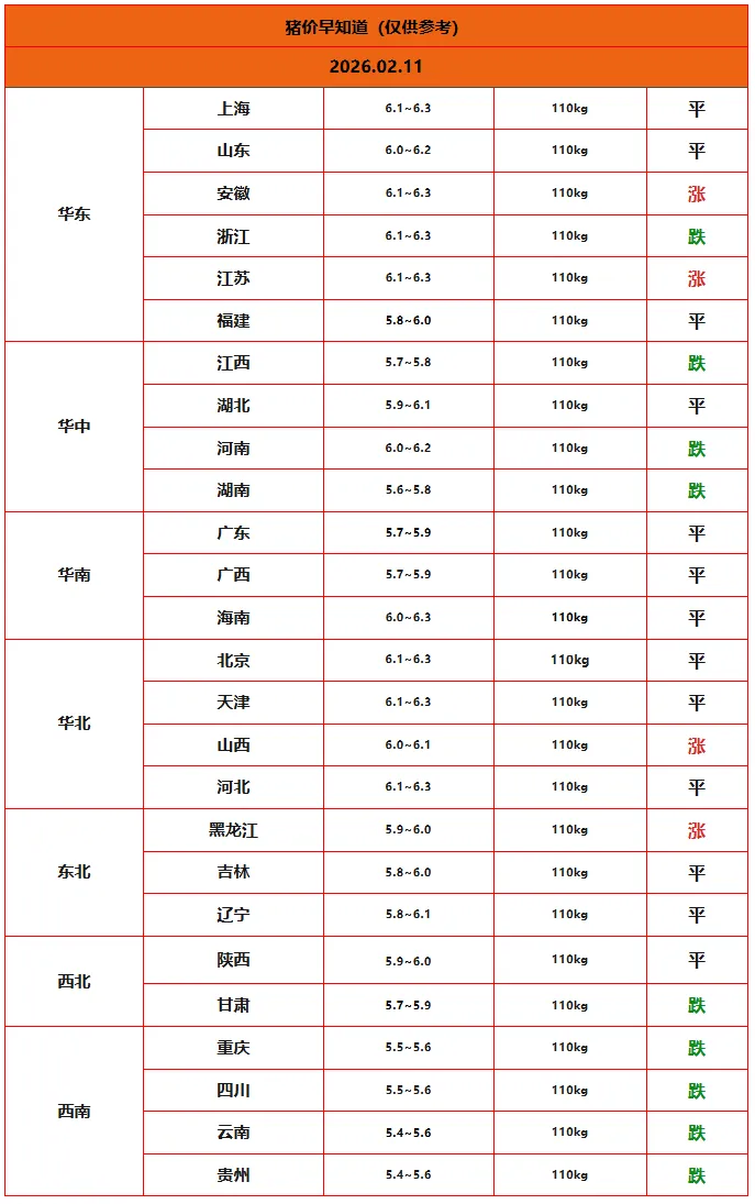 2026年02月11日全国猪价行情表 养羊网 2026-02-10 2026年02月11日全国猪价行情表以上内容源于网络,如有侵权请与我们联系,将及时删除。来源丨 畜禽报价 养羊网 2026-02-10 上一篇:猪价大跌拉开序幕,春节后猪价可能逼近5元/斤! 下一篇:【明天猪价】 2026.2.11(指导价仅供参考) 您可能还会对下面的文章感兴趣111: 相关文章 【涨】2026年1月28日鸡蛋价格,仅供参考 鸡蛋继续震荡 近期价格更新!!! 赤峰游 DAY2 阿斯哈图石林?热阿线