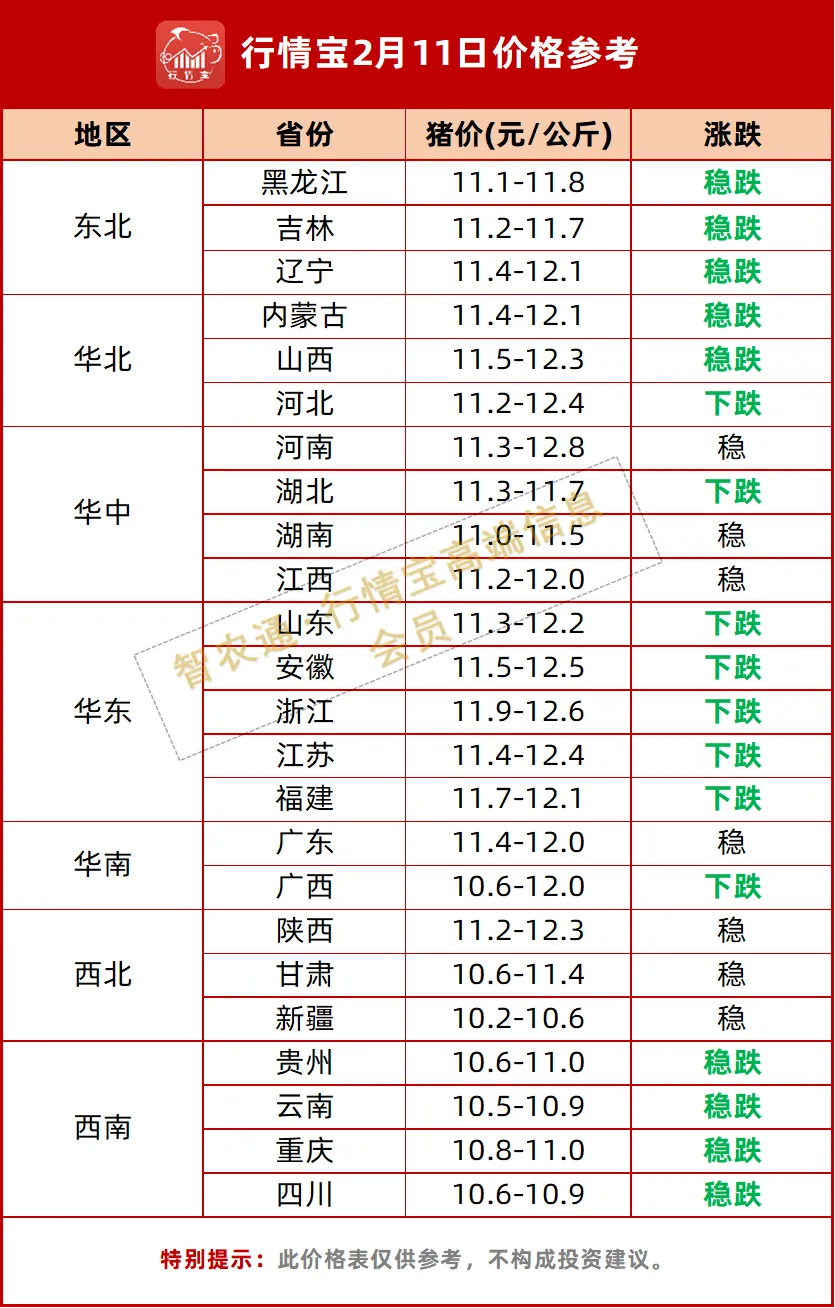 2月10日智农通 APP行情宝数据显示,今日全国生猪均价为11.69元/公斤,与昨日相比价格下跌0.18元/公斤,月环比下跌7.9%,同比下跌19.6%。
