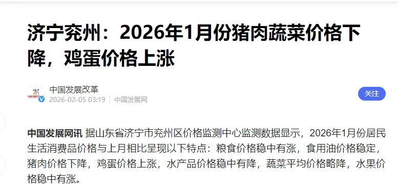 兖州2026年1月份猪肉蔬菜价格下降,鸡蛋价格上涨