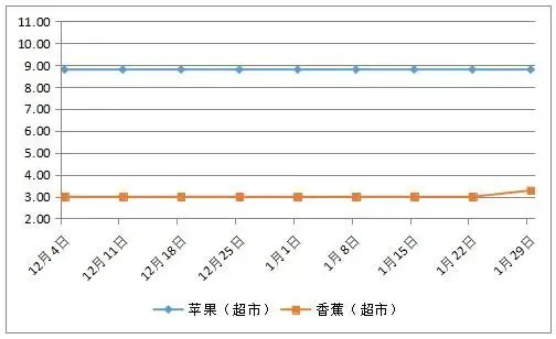 超市,苹果(红富士)平均价格为8.80元/斤,月环比持平,同期比持平;香蕉平均价格为3.05元/斤,月环比上涨2.0%,同期比下降6.2%。