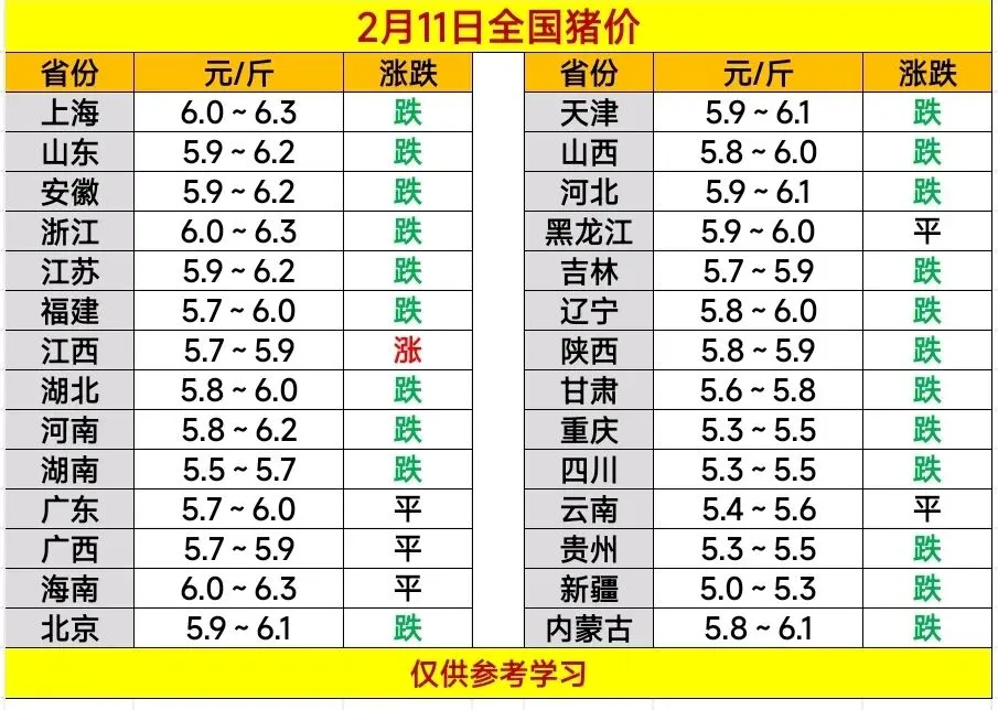 2026.2.11——明日猪价预测 养羊网 2026-02-10 2026.2.11——明日猪价预测 养羊网 2026-02-10 上一篇:2026/2/9猪价参考及养殖知识(听说母猪尿液能检查母猪是否怀孕,是真的吗?) 下一篇:多家上市猪企公布1月销售简报:猪价回暖,行业逐步复苏? 您可能还会对下面的文章感兴趣111: 相关文章 2025年4月13日全国各地生猪价格信息 2025年4月13日全国各地生猪价格信息 小红薯?万粉账号价值多少钱? 羊马套