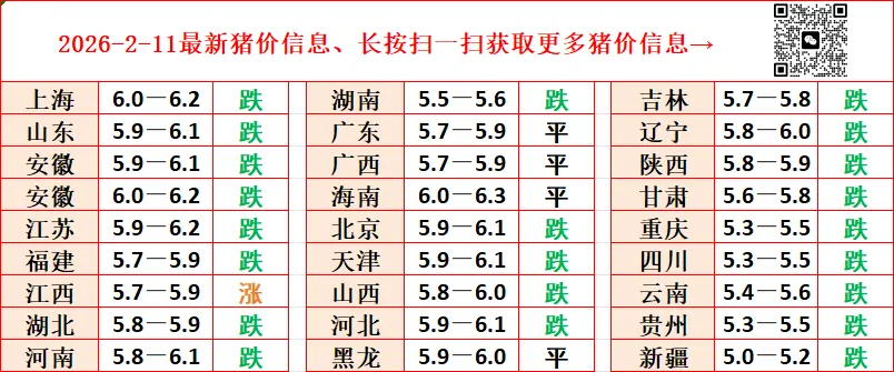 2026.2.11-明日猪价(最新猪价已更新!) 养羊网 2026-02-11 2026.2.11-明日猪价(最新猪价已更新!) 养羊网 2026-02-11 上一篇:明日猪价早知道,2026.2.11生猪价格 下一篇:猪价有变!【明天猪价】2月12日全国猪价涨跌表! 您可能还会对下面的文章感兴趣111: 相关文章 河南金秋消费券让我买到了2.7的鸡蛋 做生意好难(不卖货纯吐槽) 01月31日宜春褐壳鸡蛋价格 2025年4月13日全国各地生猪价格信息