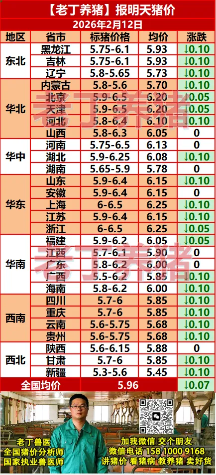 猪价有变!【明天猪价】2月12日全国猪价涨跌表!关注老丁养猪