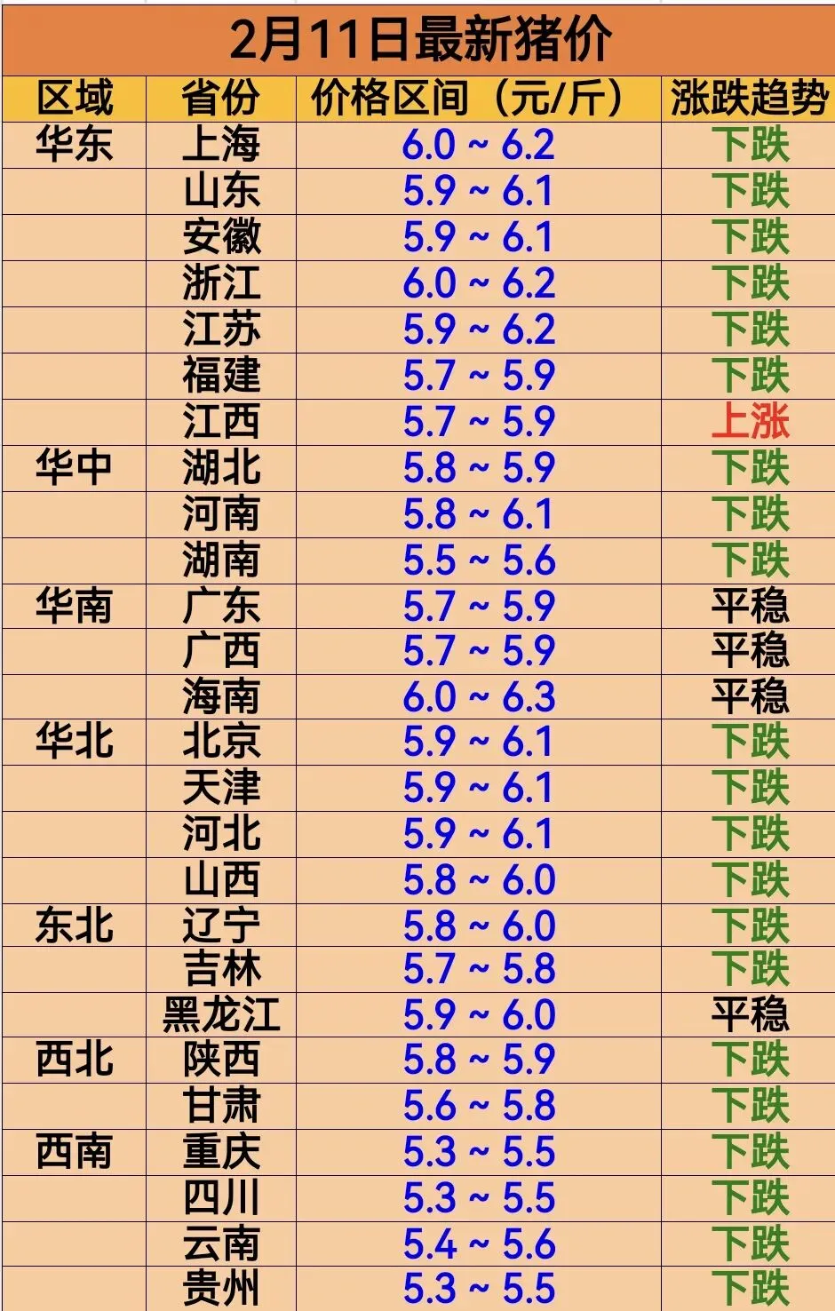 2月11日最新猪价!跌多涨少,仅一省上涨!!