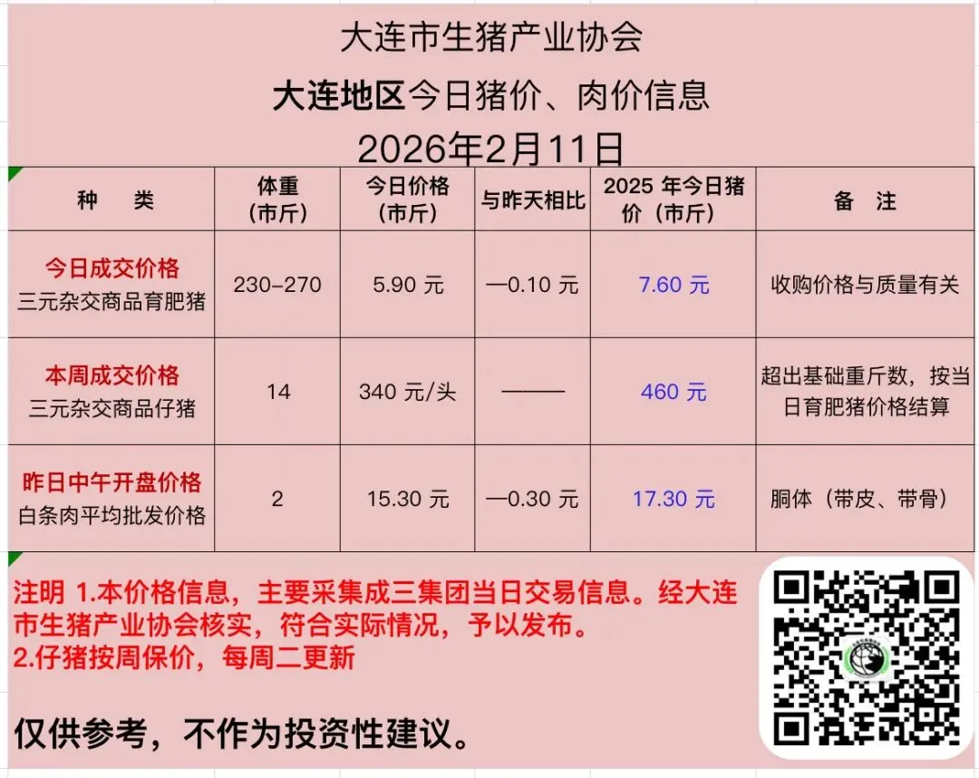 2026 年 2 月11日猪价、肉价信息 养羊网 2026-02-11 2026 年 2 月11日猪价、肉价信息天天报价大连市生猪产业协会 养羊网 2026-02-11 上一篇:2月11日云南昆明鸡蛋价格参考 下一篇:26年2月11日全国猪价 您可能还会对下面的文章感兴趣111: 相关文章 你们觉得那颗蛋是农民养的散养土鸡蛋 2026.1.17猪价出来了 明日猪价 (2026.1.28) 怎么成为千万富翁?