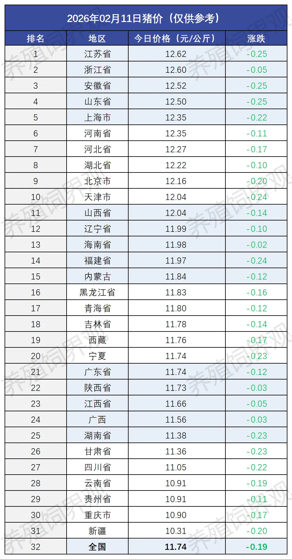 2月11日全国猪价 | 无一幸免!全国31省全部下跌,一片绿油油!