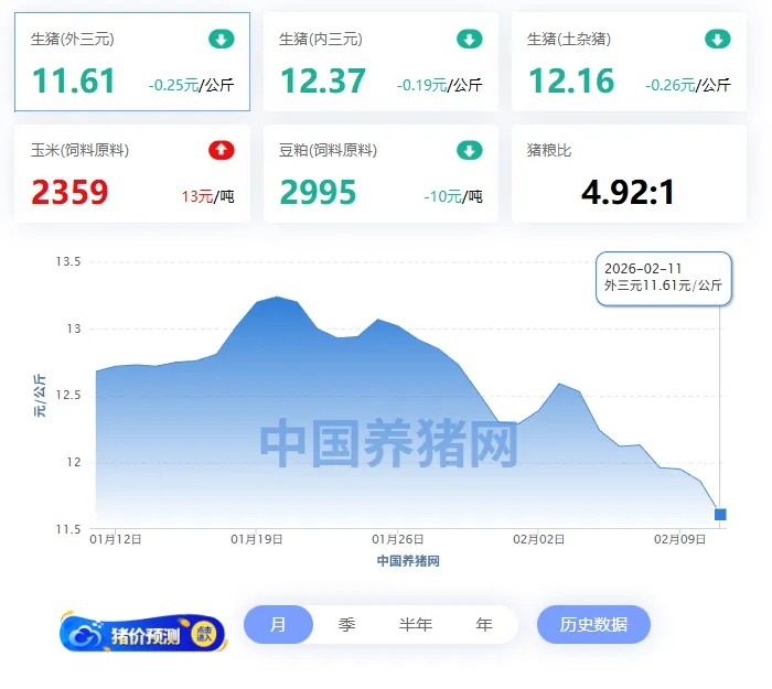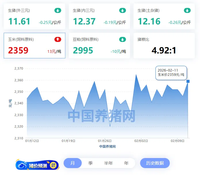 2026年02月11日-中国养猪网 全国玉米价格走势图及涨跌表