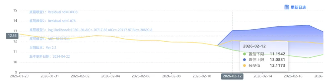 玄田算法是由项目课题组团队原创的非经典逻辑数值聚合理论和不确定性预测方法,构建了基于一致模算子的生猪价格预测模型。该模型采用的聚合函数及一致模相关理论与方法已获得多项国家自然科学基金和省级自然科学资金资助,并获得多项省级自然科学奖奖项。02月12日预测猪价为12.1173,置信区间在11.1942--13.0831之间。02月13日预测猪价为12.0040;02月14日预测猪价为12.0033。