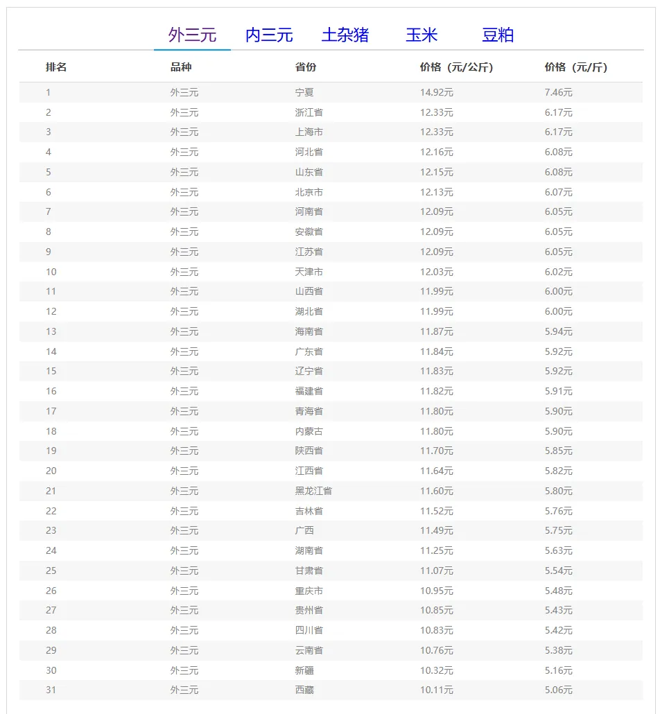 外三元排行前三:宁夏回族自治区14.92元/公斤、浙江省12.33元/公斤、上海市12.33元/公斤;