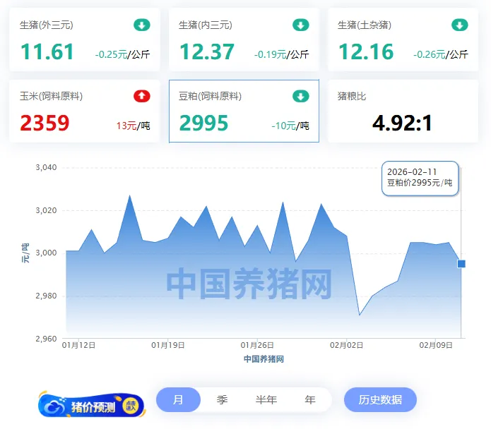 2026年02月11日-中国养猪网 全国豆粕价格走势图及涨跌表