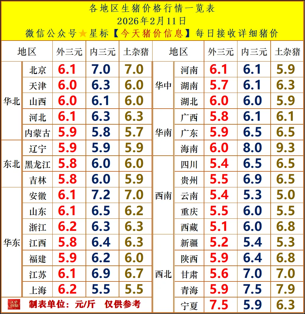今日猪价 | 2026.2.12 明天猪价行情分析!2026年02月11日猪价行情:全国综合均价5.92元/斤 外三元:5.81元/斤,较昨日下跌0.12元 内三元:6.18元/斤,较昨日下跌0.09元 土杂猪:6.06元/斤,较昨日下跌0.13元