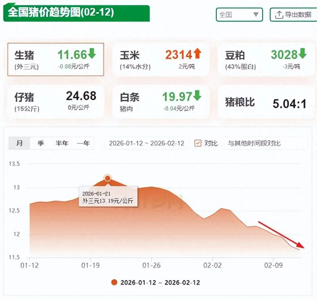 春节越来越近,家家户户的“菜篮子”备货进入高峰期,但是猪价却呈现出“一跌不回头”的态势!据猪好多数据监测显示,2026年2月12日农历廿五,全国外三元生猪均价为11.66元/公斤,较昨日下跌0.08元/公斤,较上周四(2月5日农历十八)下跌0.66元/公斤,周内生猪价格跌幅5.35%,猪价“逢节必跌”的情况再度上演!