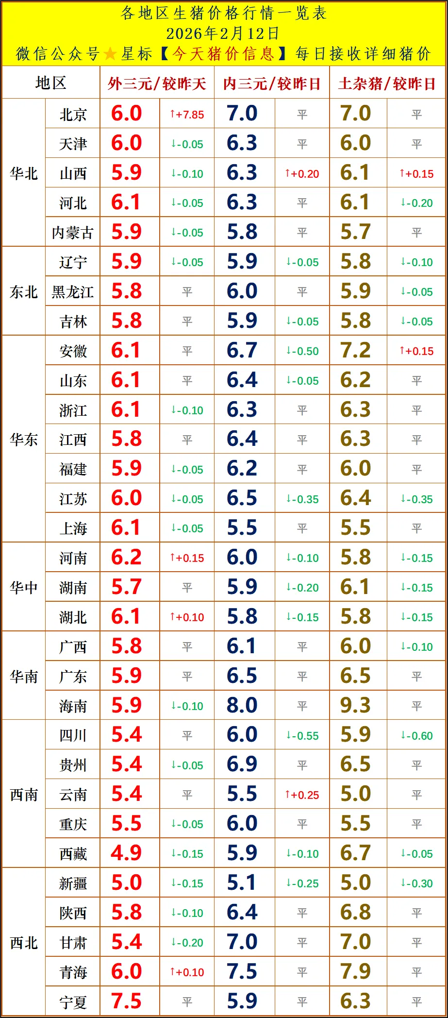 今日猪价 | 2026.2.13 明天猪价走势信息!2026年02月12日猪价行情:全国综合均价5.77元/斤 外三元:5.78元/斤,较昨日下跌0.02元 内三元:6.11元/斤,较昨日下跌0.07元 土杂猪:6.01元/斤,较昨日下跌0.07元
