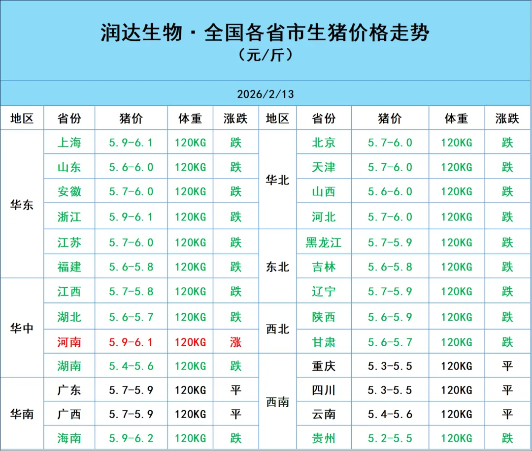 2026年2月13日明日猪价行情:猪价跌跌不休! 养羊网 2026-02-12 2026年2月13日明日猪价行情:猪价跌跌不休!免责申明:本微信服务平台资料来源于网络收集,以供给大家学习、交流为目的,请诸位在阅读后,尽快删除,尊重资料原作者,支持正版。若所列资源侵犯了您的权益请直接留言,立刻删除! 养羊网 2026-02-12 上一篇:2026-2-13 明日猪价早预知 下一篇:2026.2.13明日全国最新猪价信息(上涨地区增多!) 您可能还会对下面的文章感兴趣111: 相关文章 近期价格更新!!! 做多鸡蛋,一地鸡毛 TOP 无锡鸡蛋饼天花板被我找到了! 1月28日猪价|速看!(仅供参考,关注转发!)