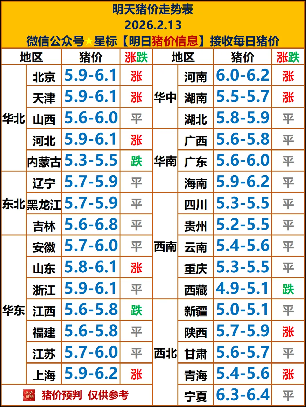 明天2026.2.13, 最新猪价走势详情! 养羊网 2026-02-12 明天2026.2.13, 最新猪价走势详情!明天2月13日全国外三元均价预计约11.5-11.7 元 / 公斤(5.75-5.9 元 / 斤),北方局部抗价、南方偏弱。东北、华北局部小幅反弹,南方多省稳中小跌,价差扩大。预判2 月下旬:维持震荡偏弱,均价或下探11.2-11.5 元 / 公斤;春节后消费转淡,价格或进一步承压。?建议:顺势出栏,不盲目压栏赌反弹,关注收储政策与出栏节奏变化。 养羊网 2026-02-12 上一篇:涨!2026.2.13明日猪价早知道 | 2026.2.13明日猪价最新报价 下一篇:【明日猪价】2月13日(涨涨涨,没了!全国猪价最新报价) 您可能还会对下面的文章感兴趣111: 相关文章 “发财了” 一代人有一代人的鸡蛋要领? 近期价格更新!!! 2025年4月13日全国各地生猪价格信息