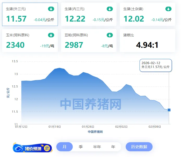 02月12日猪价:“滑滑梯”!节前旺季上演反常大跌,11元关口承压!