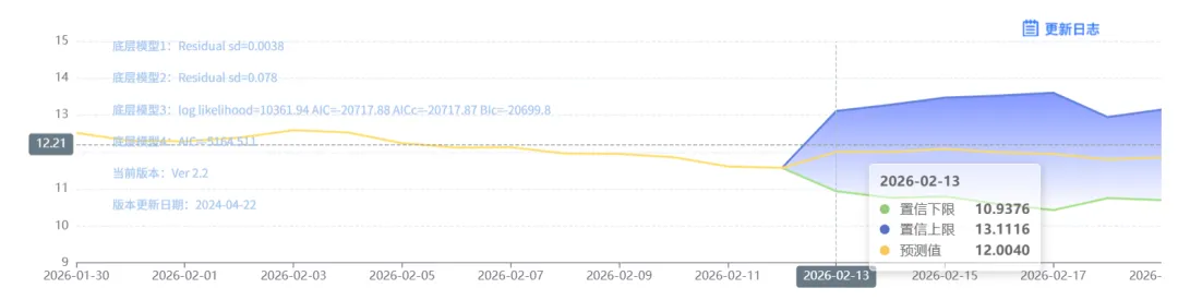 玄田算法是由项目课题组团队原创的非经典逻辑数值聚合理论和不确定性预测方法,构建了基于一致模算子的生猪价格预测模型。该模型采用的聚合函数及一致模相关理论与方法已获得多项国家自然科学基金和省级自然科学资金资助,并获得多项省级自然科学奖奖项。02月13日预测猪价为12.0040,置信区间在109376--13.1116之间。02月14日预测猪价为12.0033;02月15日预测猪价为12.0835。