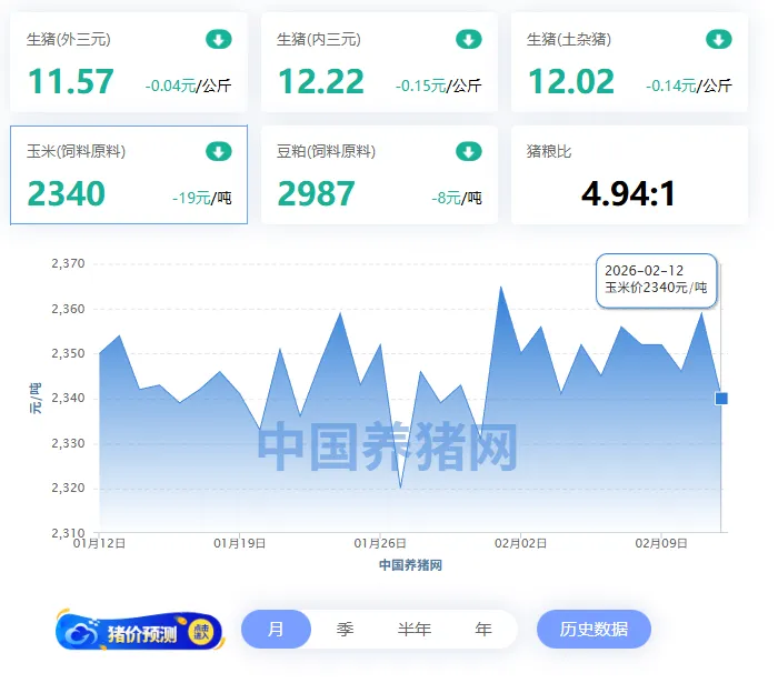 2026年02月12日-中国养猪网 全国玉米价格走势图及涨跌表