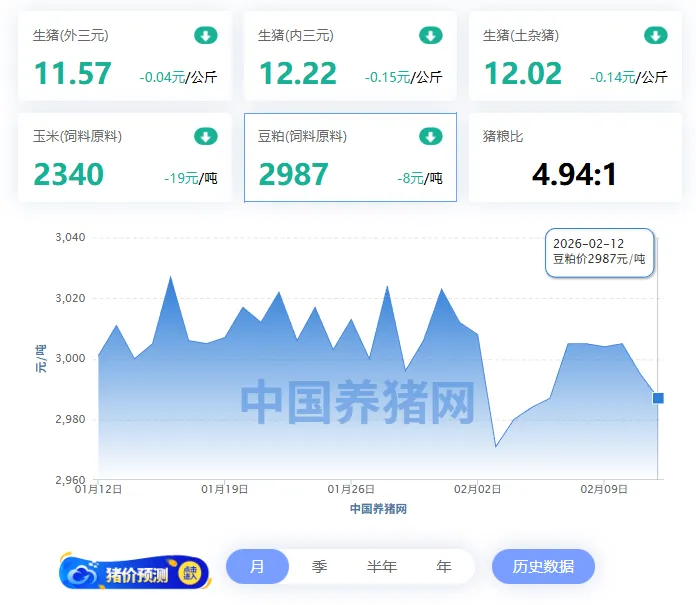2026年02月12日-中国养猪网 全国豆粕价格走势图及涨跌表