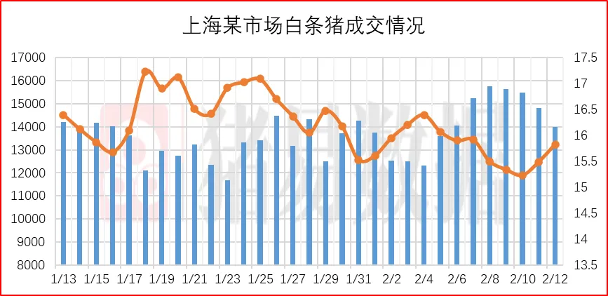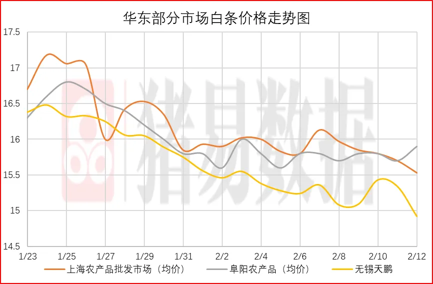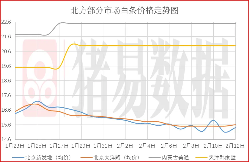 从今日北京、上海消费城市批发市场白条价格走势来看,北京、上海批发市场白条成交价格呈现跌涨调整,北京市场开磅价稳定为主,市场成交均价表现一般,市场走货速度表现偏快;上海市场价格呈现跌涨调整,部分市场成交价参考15.53-15.83元/公斤,到货量减少,市场交易情绪表现一般,市场成交均价表现一般。