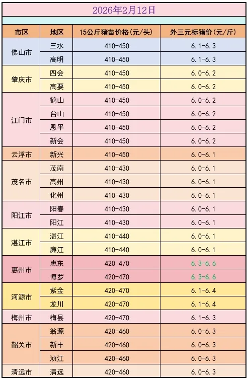 2月12日猪价速递 养羊网 2026-02-12 2月12日猪价速递广东猪苗全省各地报410~470元起,毛猪报6.0~6.6元,除惠州跌价外,其它地区价格稳定。年关行情已启动,节奏瞬息,踏准步伐。(行情仅供参考) 养羊网 2026-02-12 上一篇:2026-02-13明日猪价 下一篇:每日猪价| 2026.2.13 陕西涨 您可能还会对下面的文章感兴趣111: 相关文章 2026. 02. 12 全国猪价! 1月31日全国最新鸡蛋价格:再度启航,奋力前进. 2025年10月6日全国各地生猪价格信息 2025年4月13日全国各地生猪价格信息