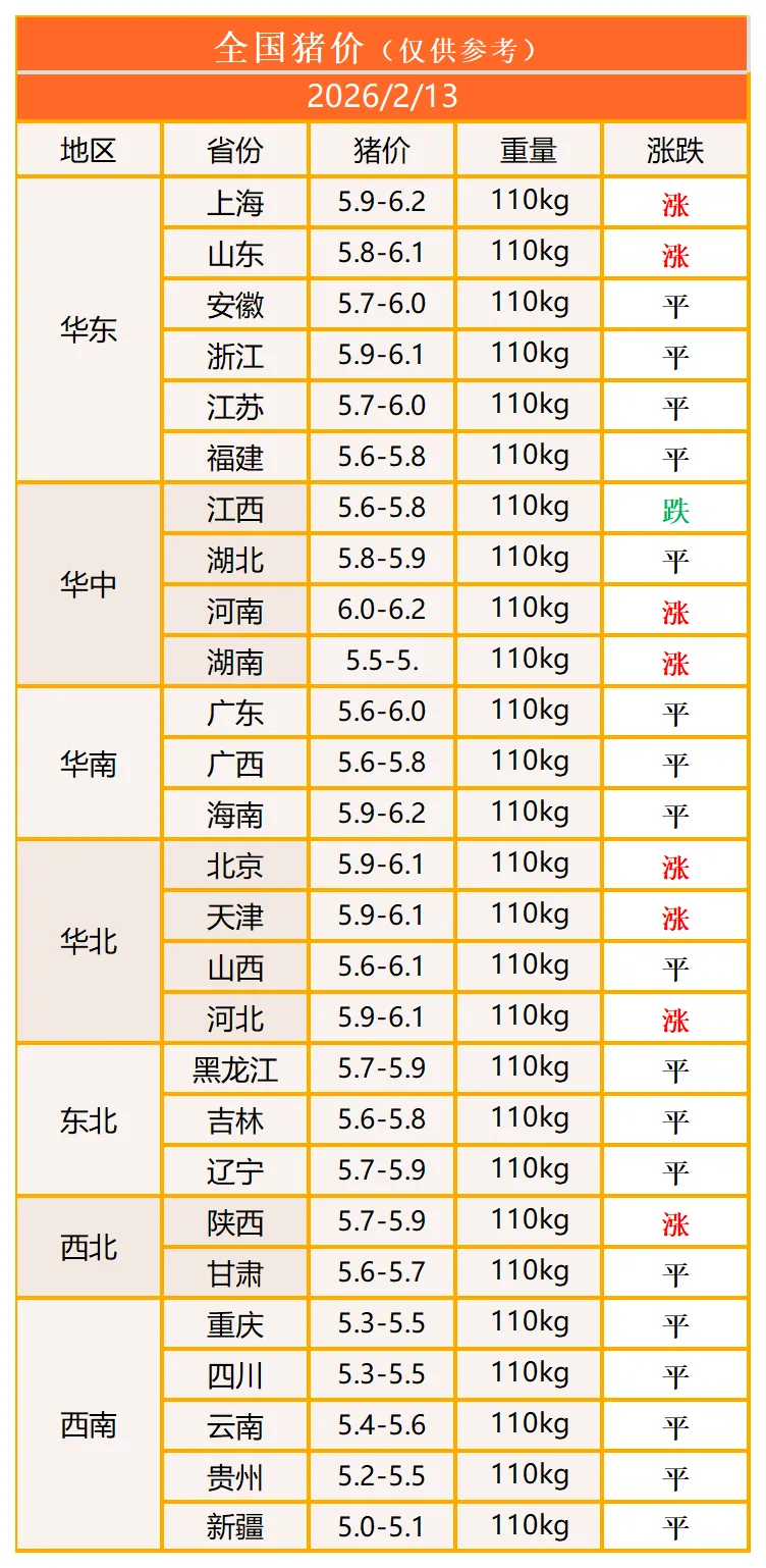 明日猪价2026年2月13日猪价信息 养羊网 2026-02-12 明日猪价2026年2月13日猪价信息图中二维码 >添加关注领异标新 鲜声夺人多用心 同分享长按指纹 >识别 养羊网 2026-02-12 上一篇:2月12日东莞信立农批鸡蛋价格 下一篇:2026.2.13明日最新猪价 您可能还会对下面的文章感兴趣111: 相关文章 农村土鸡蛋 鸡蛋7货——温度下降对?的影响 2025年4月13日全国各地生猪价格信息 紧急提醒:猪价上涨面临压力,出栏窗口收紧!