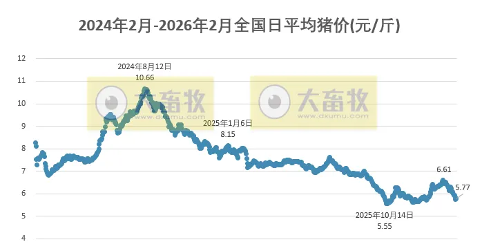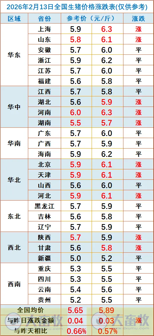 大畜牧小编根据我国27省的猪价数据,计算出2026年2月13日全国平均猪价为每斤5.77元,比昨天上涨0.03元,涨幅为0.61%,止跌上涨,且结束连续5天的下跌;