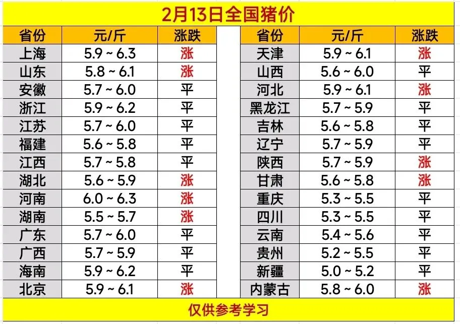 2026.2.13——明日猪价预测 养羊网 2026-02-12 2026.2.13——明日猪价预测 养羊网 2026-02-12 上一篇:2026年2月12日鸡蛋价揭秘,这个价买到手,消费者生产者都乐了 下一篇:2026.2.12河北馆陶鸡蛋报价 您可能还会对下面的文章感兴趣111: 相关文章 近期价格更新!!! 2026.1.9-鸡蛋价格 近期价格更新!!! 2025年4月13日全国各地生猪价格信息